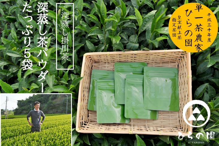 皇室献上茶指定茶園シングル茶農家の「深蒸し茶パウダー 5袋」 ◆皇室献上茶指定茶園 シングル茶農家◆ 「深蒸し茶パウダー 5袋」 ひらの園は、茶畑での栽培、茶工場での製造、販売まですべて一貫して自園のみで行う「シングル茶農家」です。